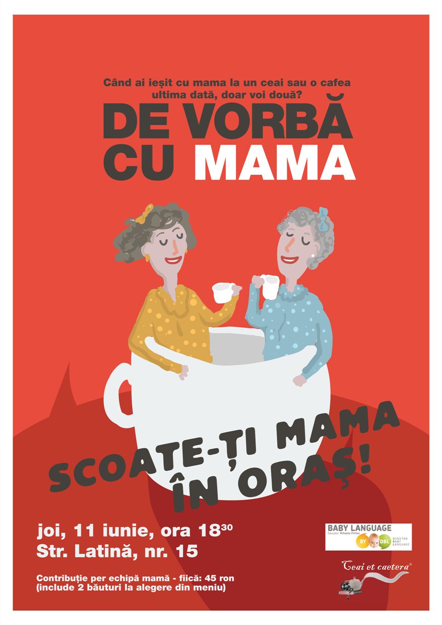 Despre toate acestea vom discuta într-o atmosferă relaxată, joi, 11 iunie începând cu ora 18,30 la o cană de ceai de vorbă cu mama. Investiție: 45 ron pentru perechea mamă – fiică (include două băuturi la alegere din meniul ceainăriei).
