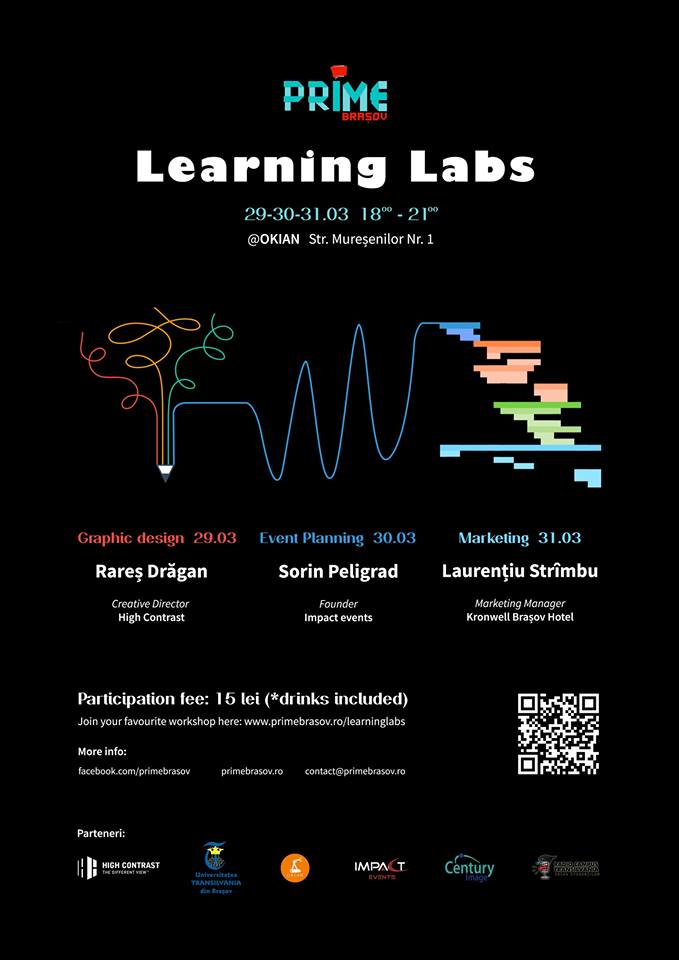 Dacă ești student, pasionat de design grafic, organizarea evenimentelor sau marketing și ai cunoștințele minime în aceste domenii, atunci PRIME Brașov ți-a pregătit un maraton de workshopuri pe gustul tău. În cadrul PRIME Learning Labs, îți oferim posibilitatea de a-ți îmbunătăți cunoștințele prin 3 workshopuri practice, unde vei avea ocazia să înveți din experiența reprezentanților unora dintre mai cunoscute companii din Brașov. Este șansa ta de a deveni un bun profesionist și de a-ți lărgi posibilitățile de networking.